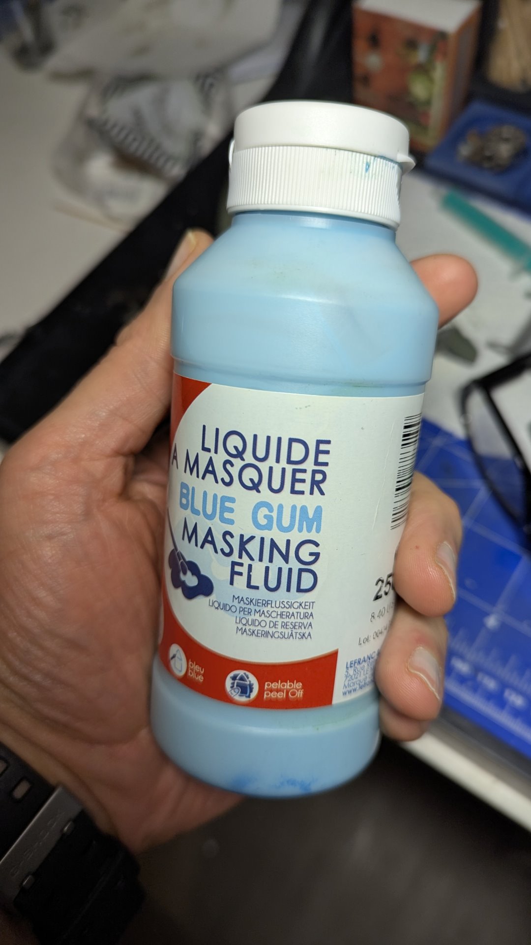 Ich muss sagen, das Zeug macht mir richtig viel Spaß. Man kann sich einige Arbeit damit ersparen, wenn man es an den richtigen Stellen einsetzt. Sucht man unter den Stichworten "Maskierflüssigkeit" oder "Rubbelkrepp" in einem Internetshop danach, so stolpert man beinahe sofort über eine Vielzahl von Marken. Ich hatte mich für dieses Fabrikat entschieden: