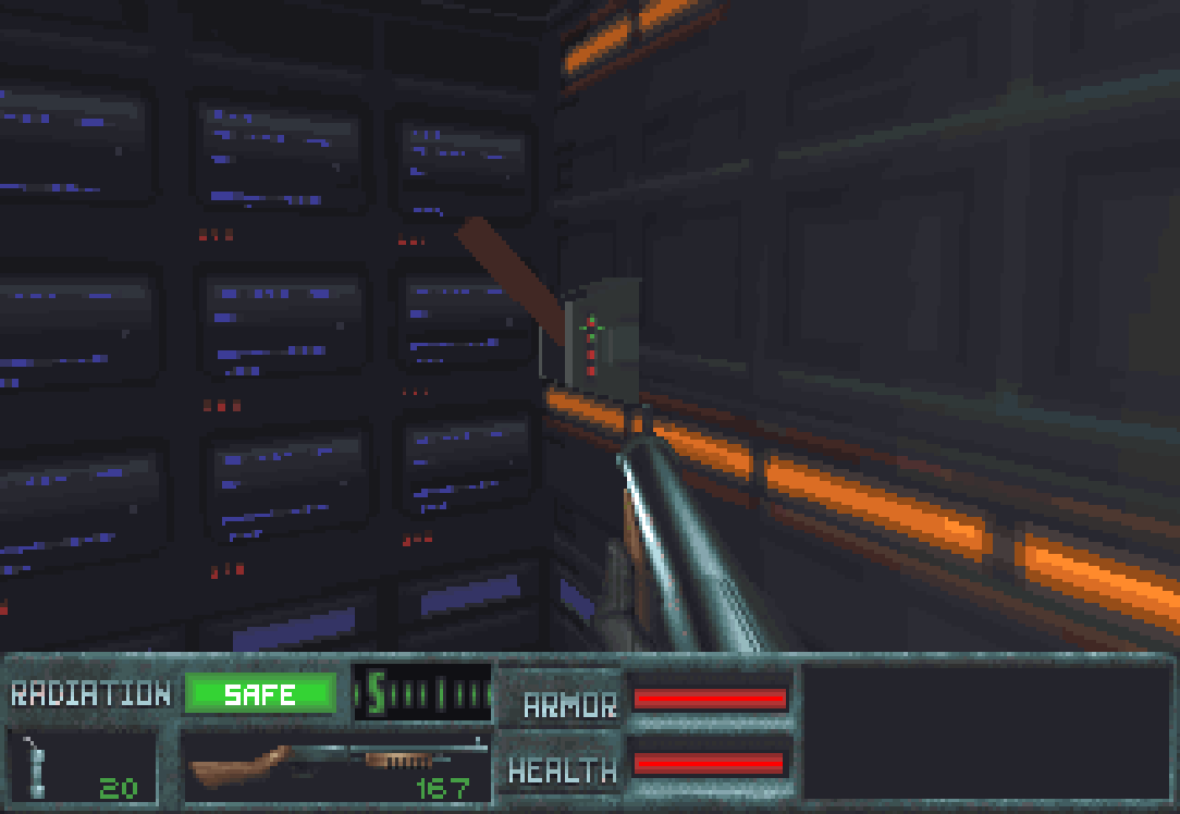 Mithilfe eines Schalters in einem Nebenraum, der natürlich ebenfalls bewacht ist, können wir eine Wand im Kontrollraum verschieben. Das gibt uns einerseits die Möglichkeit, über einen kleinen Hüpf-Parcours ein wenig zusätzliche Panzerung, Munition und Medipacks zu bekommen, andererseits wird auf diese Weise der Weg zu einer verborgenen Kammer freigemacht.