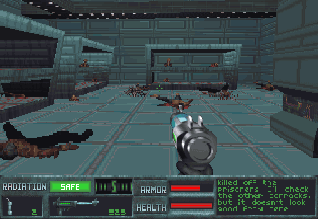 Nun gilt es, die drei Baracken des Todeslagers zu durchsuchen. Die Reihenfolge, in der ich das mache, ist weitgehend egal. Das Ergebnis ist immer das gleiche: Die Maschinen haben ein Massaker angerichtet und alle Gefangenen abgeschlachtet; darunter natürlich auch der Kollege, den ich finden sollte. Das ist blöd, aber immerhin finde ich meine erste Strahlenpistole: