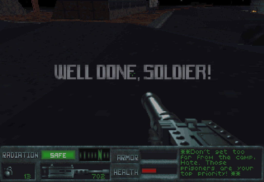 Der Trick war dann, einfach weiter geradeaus zu laufen. Wenn man die Straße erreicht, rennt man gegen eine unsichtbare Wand und bekommt den Hinweis, man soll sich nicht so weit vom Lager entfernen. Wenn man dann ein bisschen hin und her wackelt, erscheint irgendwann plötzlich das erlösende "Well done, Soldier!"