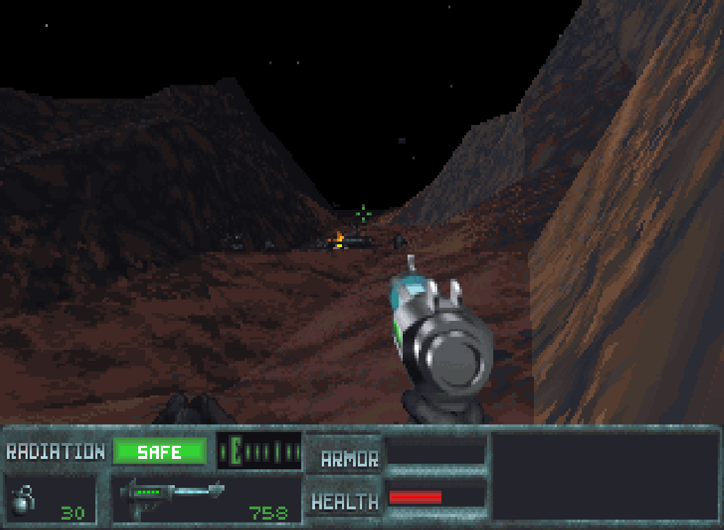 Und hier geht es dann so richtig dreckig los. Die Maschinen greifen von allen Seiten her an - auch von oben. Glücklicherweise ist das Gelände nicht allzu verwinkelt, sodass ich die Angreifer gut sehen und einzeln in's Visier nehmen kann. Das "Zielfernrohr" des Plasmagewehrs funktioniert dabei erstaunlich gut - auch wenn es nur sehr pixelige Bilder liefert.
