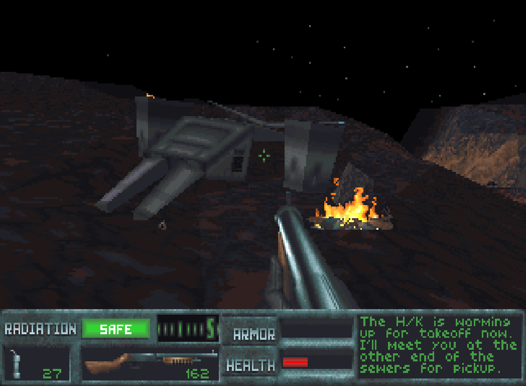 Ich soll mich also zunächst bis zum Eingang der Kanalisation vorkämpfen und dann zu einem abgestürzten Hunter-Killer begeben. Sobald ich eine Fernsteuerung an diesem befestigt habe, soll ich dann weiter durch die Kanalisation flüchten. Am andere Ende der Tunnels warten dann meine Widerstands-Kumpels auf mich.