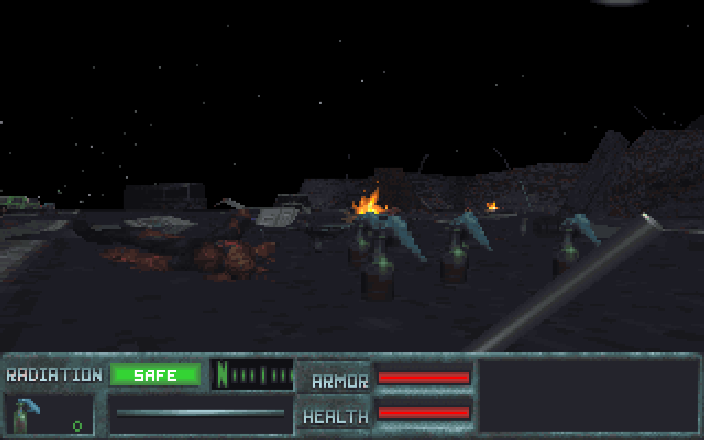 Man stand plötzlich direkt in einem Film, den man nie gesehen hatte, der aber genauso aussah, wie man ihn sich vorgestellt hatte. Unzählige kleine Feuer prasseln, eine im Wind auf- und zuschwingende Tür quietscht irgendwo vor sich hin ... und überall könnte ein Terminator auf uns lauern. Das war - und ist heute noch - eine Atmosphäre, so dick, dass man sie mit einem Messer schneiden könnte. Und wir stehen mittendrin, nur mit einer bekackten Eisenstange bewaffnet. Jeder, der anno 1984 "Terminator" gesehen hatte, wusste genau, was man mit einer Eisenstange ausrichten konnte - nämlich ungefähr genau nix! Aber da liegen ja ein paar Molotow-Cocktails herum. Und hey, unser abgelebter Widerstandskumpel hatte auch noch eine MAC-10 dabei.