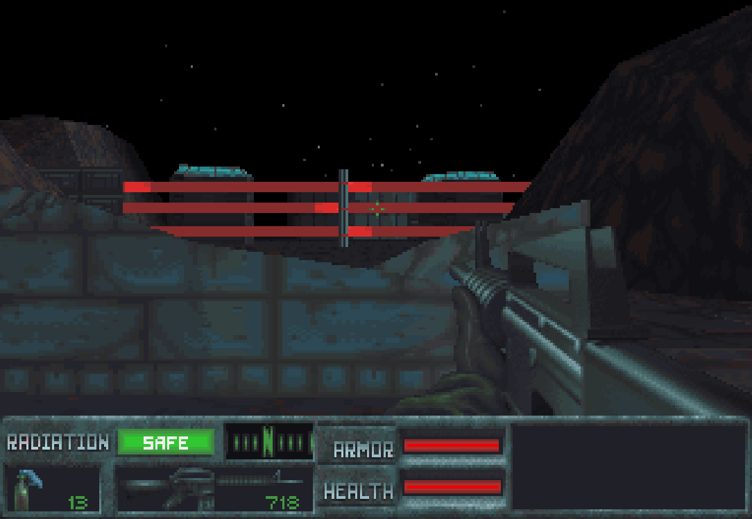 Im Lager angekommen muss man sich zunächst mit einigen Lasergeschützen herumschlagen, die auf Türmen montiert sind. Glücklicherweise lassen sich diese Geschütze ziemlich problemlos entweder aus der Distanz ausschalten, bevor sie das Feuer eröffnen können, oder man kann sich vorsichtig an eine Ecke heranarbeiten und aus dem toten Winkel heraus schießen.