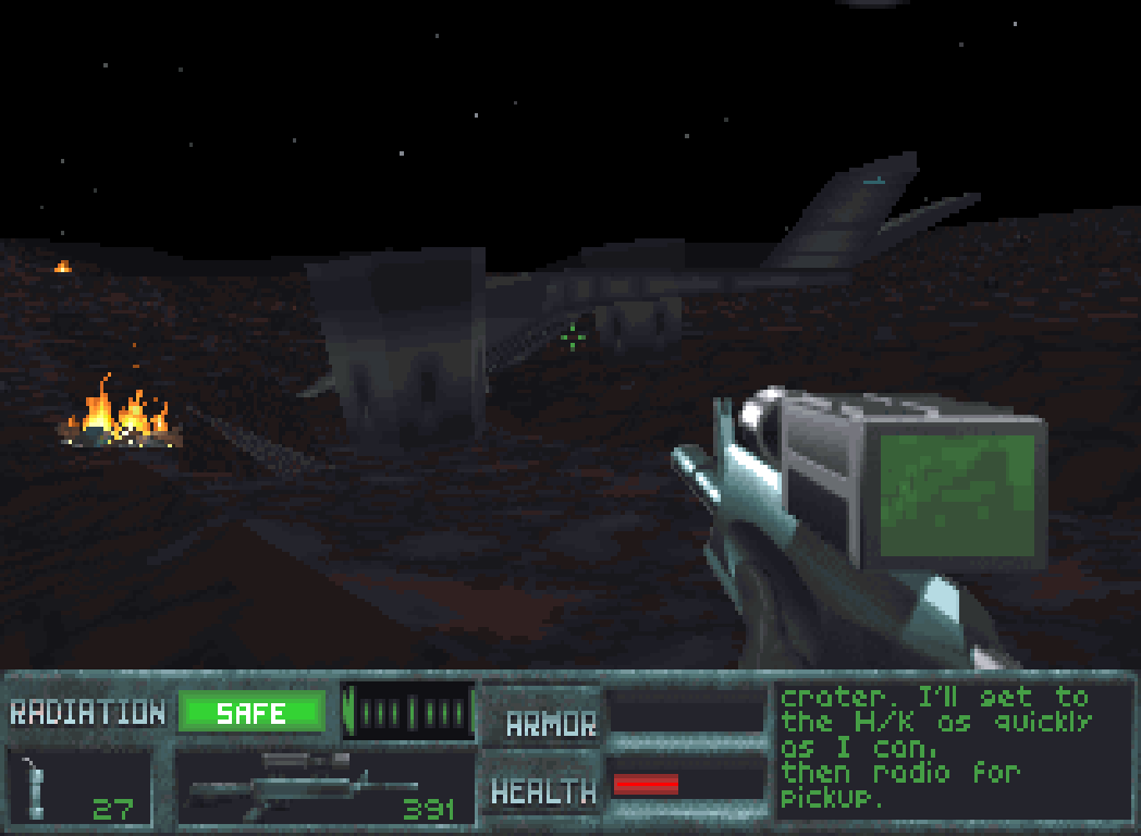 Ich soll mich also zunächst bis zum Eingang der Kanalisation vorkämpfen und dann zu einem abgestürzten Hunter-Killer begeben. Sobald ich eine Fernsteuerung an diesem befestigt habe, soll ich dann weiter durch die Kanalisation flüchten. Am andere Ende der Tunnels warten dann meine Widerstands-Kumpels auf mich.